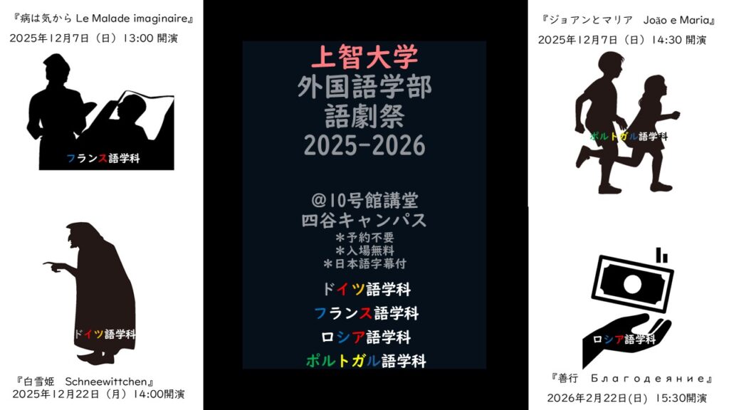 上智大学で伝統的に受け継がれてきた「外国語学部語劇祭」が今年も開催されます。今回は4年ぶりにポルトガル語劇団も復活し、ドイツ語、フランス語、ロシア語の劇団もあわせて、4つの語劇が上演されます。